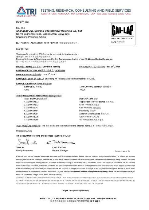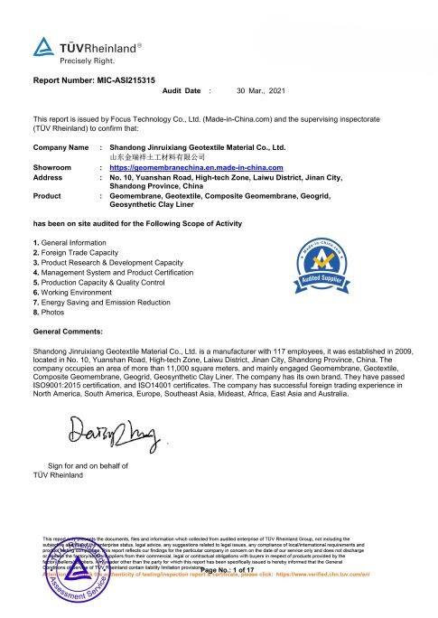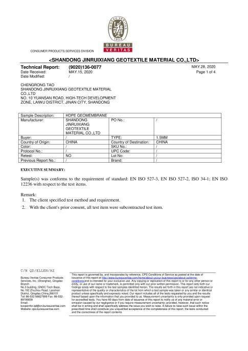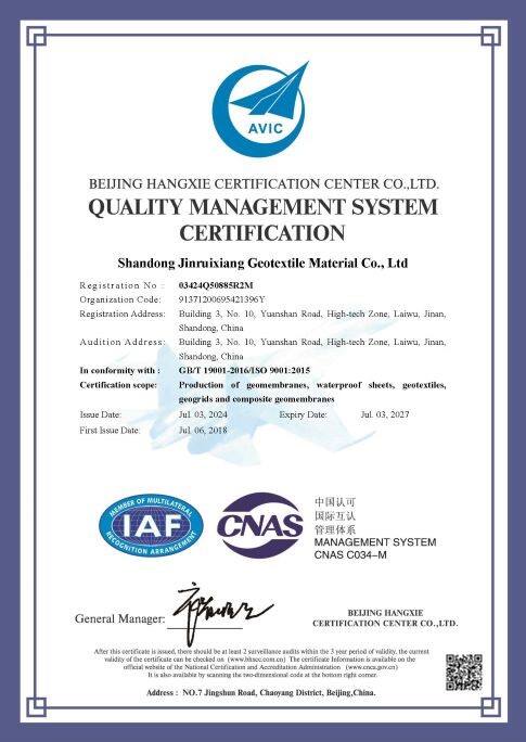 Based in Jinan Shandong, Jinruixiang is a professional manufacturer and exporter of geosynthetic materials integrating R&D, production and international trade. Our core products cover HDPE geomembrane, geotextile, geogrid, geocell, drainage cell etc., with annual output over 40,000 tons and advanced production & testing equipment, certified by ISO9001.